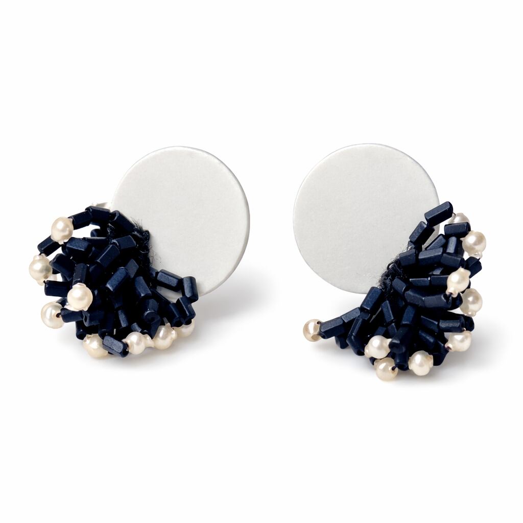 mouth-blown glass, are paired with small yet striking black beads with a